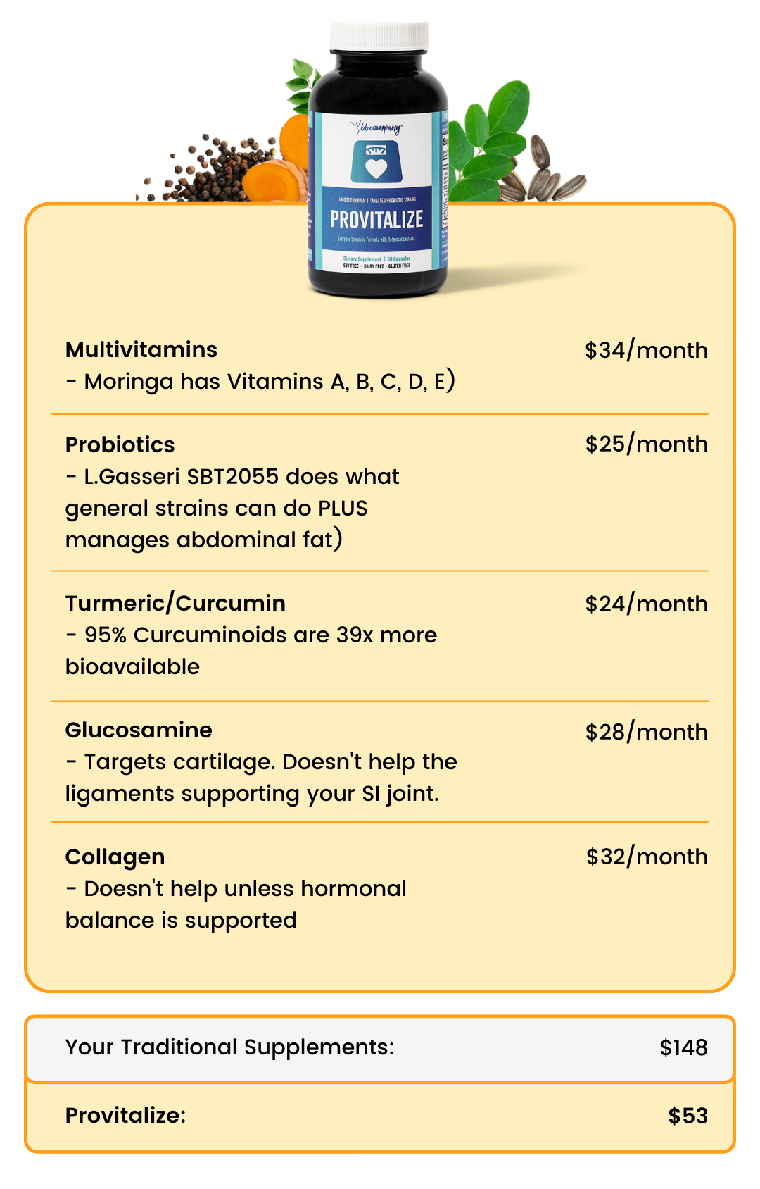 Provitalize is a revolutionary curcumin-moringa-probiotic blend specifically designed to nourish and protect the ligaments that stabilize your SI joint.