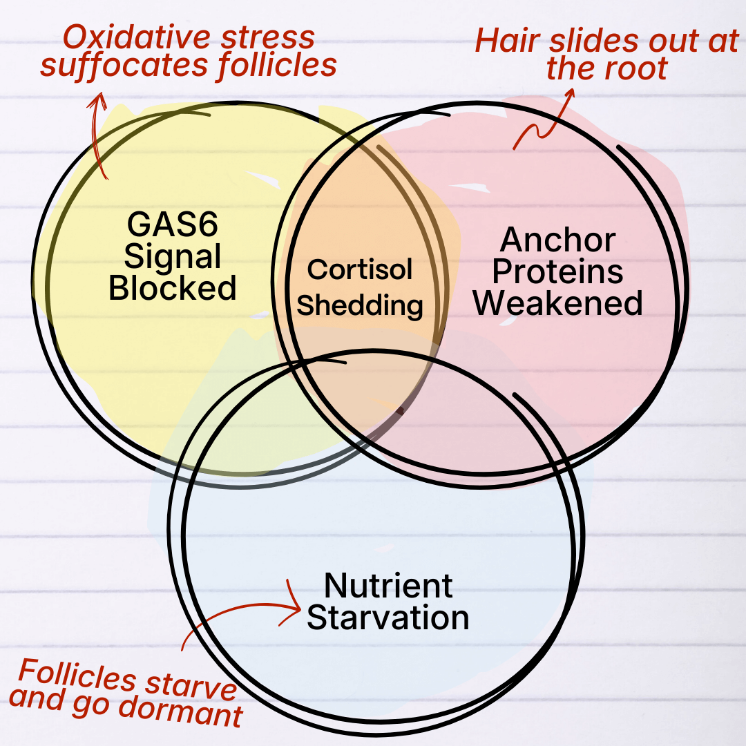 Yes. Cortisol breaks down the follicle's anchor proteins (COL17A1) and blocks the GAS6 signal that tells follicles to keep growing. It's not "just stress." It's a biological shutdown.