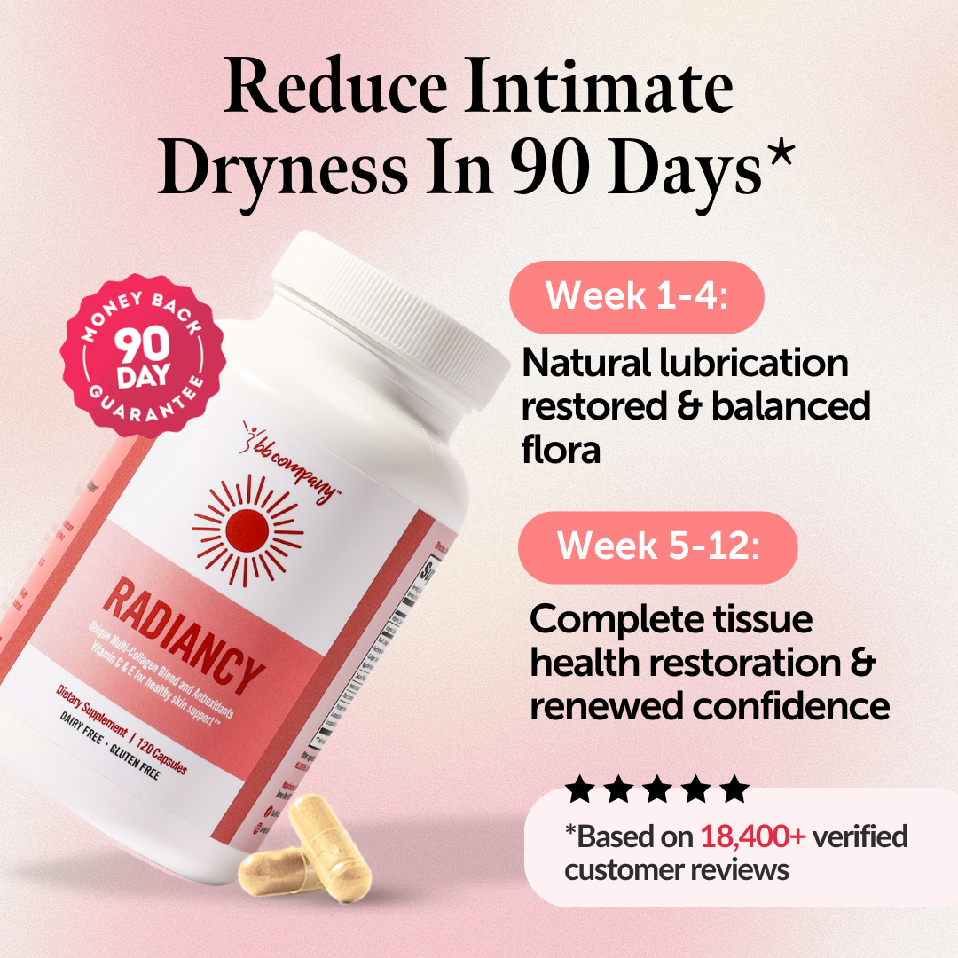 💬 "Radiancy has improved my skin, reduced yeast infections, vaginal dryness...and enhanced sexual intimacy. After one bottle I noticed improvements. At age 58, it has helped increase lubrication and reduced soreness." — Patricia
